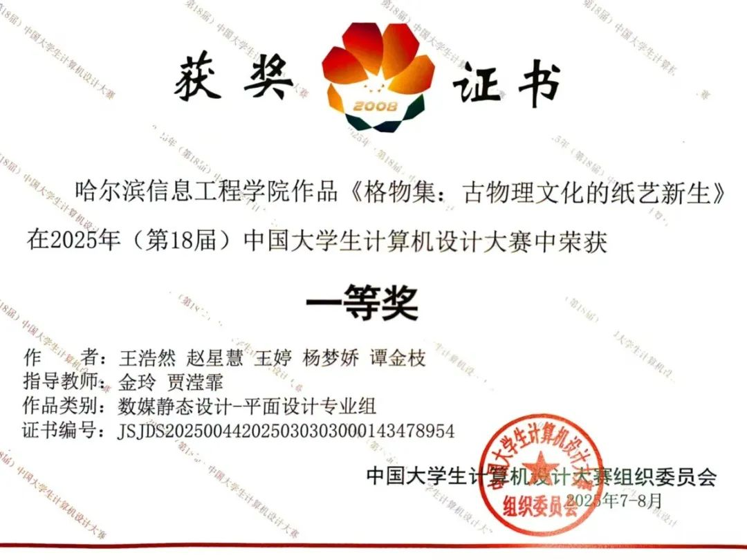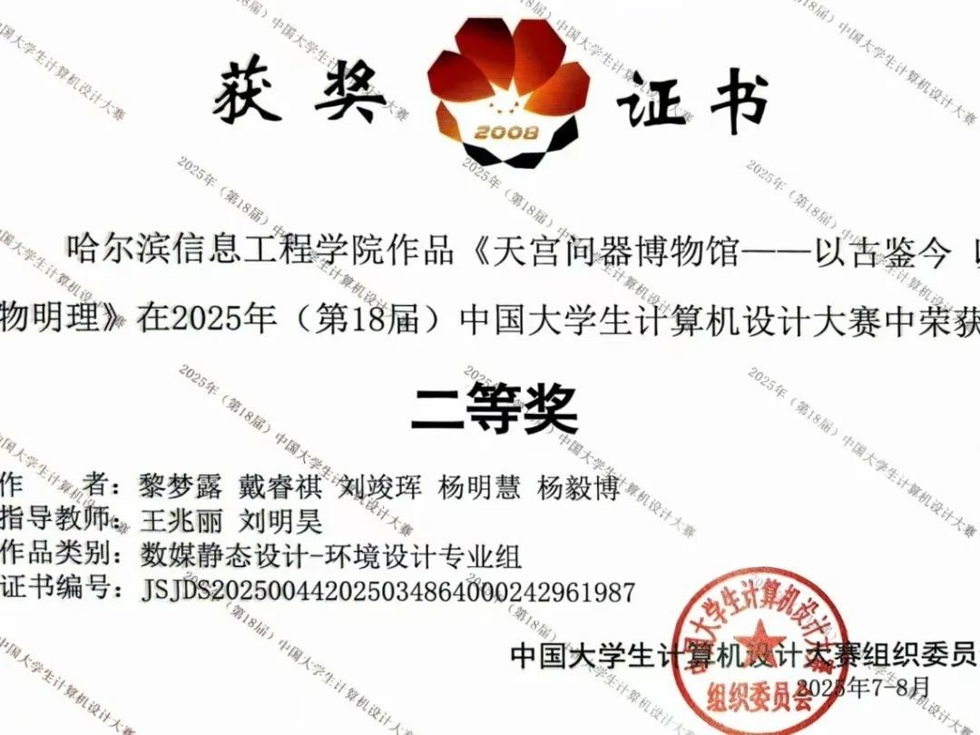 2025年7月26日(第18届)中国大学生计算机设计大赛决赛圆满落幕。在“数媒静态设计”赛道中,哈尔滨信息工程学院艺术设计学院学子作品《格物集:古物理文化的纸艺新生》荣获国赛一等奖,《天宫问器博物馆——以古鉴今以物明理》荣获国赛二等奖。祝贺我院学子载誉而归,期待他们未来取得更优异成绩!