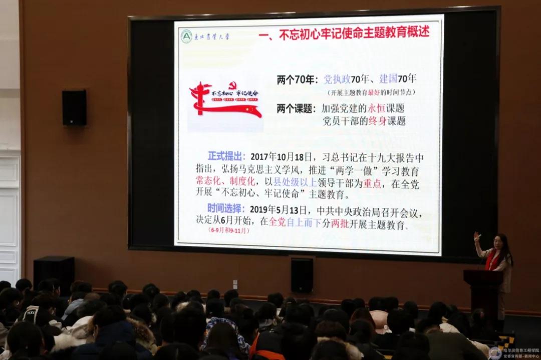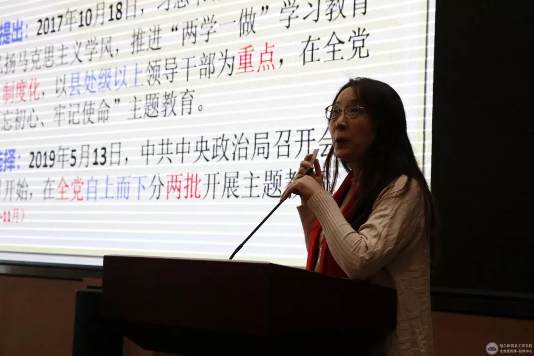 为纪念党执政70周年和建国70周年,深入学习贯彻习近平新时代中国特色社会主义思想,深入推进党的建设,助力“不忘初心,牢记使命”主题教育再升温。2019年11月28日下午,哈尔滨信息工程学院基础部、教务处邀请东北农业大学马克思主义中国化研究二级学科带头人、黑龙江省中共党史学会、省高校“毛中特”教研会、省高校研究生思政课研究会常务理事,省大学生青年马克思主义者培养工程导师孙玉娟教授走进校园,于艺体中心报告厅开展了长达两个小时的“坚守初心牢记使命,勇做时代弄潮儿”专题讲座。软件学院党总支书记曲丽媛老师、基础部主任郝庆华老师、思政教研室主任蔡玉秋老师、基础部李鑫老师、刘月群老师聆听讲座。