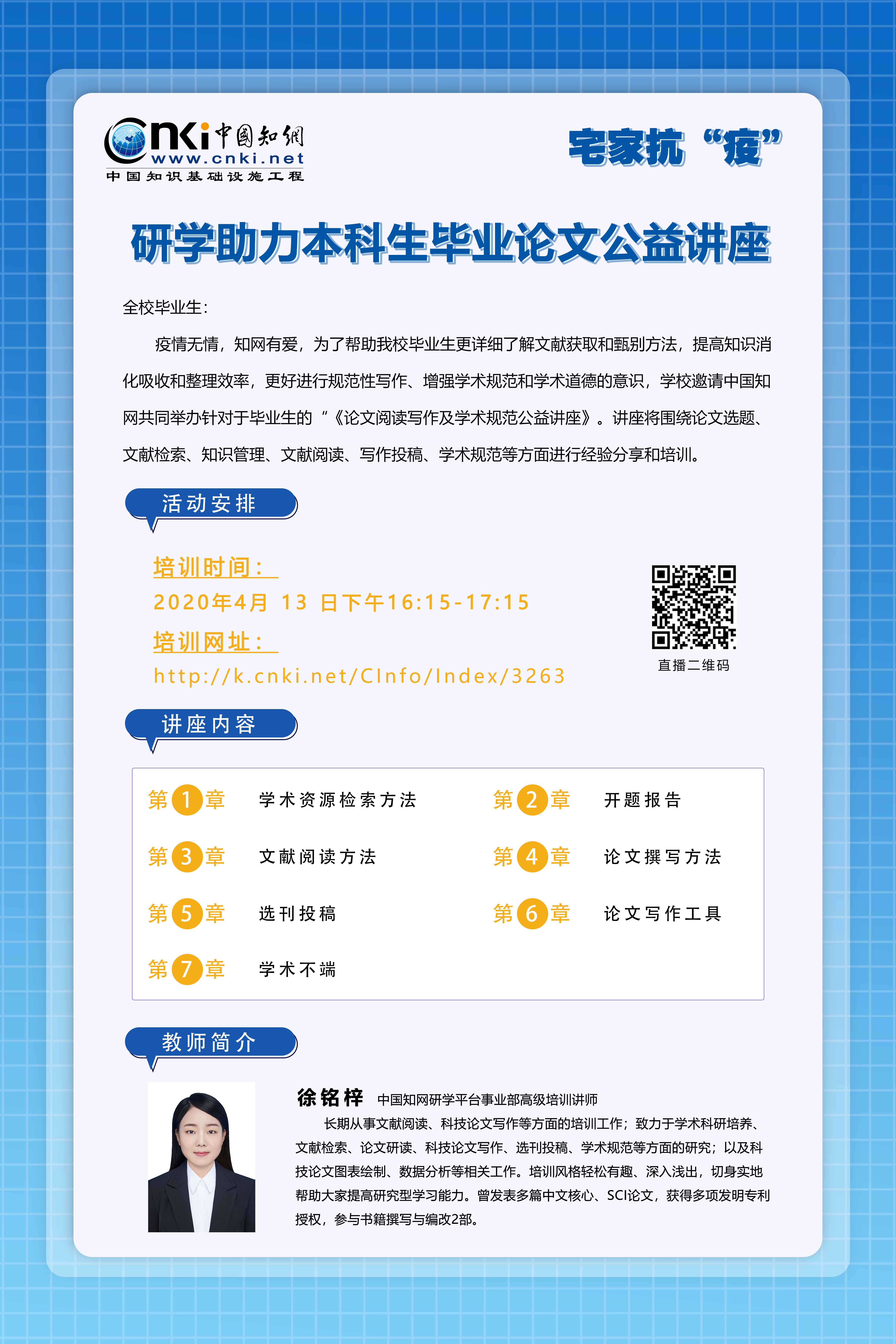 疫情无情,知网有爱,为了帮助我校毕业生更详细了解文献获取和甄别方法,提高知识消化吸收和整理效率,更好进行规范性写作、增强学术规范和学术道德的意识,学校邀请中国知网共同举办针对于毕业生的“《论文阅读写作及学术规范公益讲座》。讲座将围绕论文选题、文献检索、知识管理、文献阅读、写作投稿、学术规范等方面进行经验分享和培训。