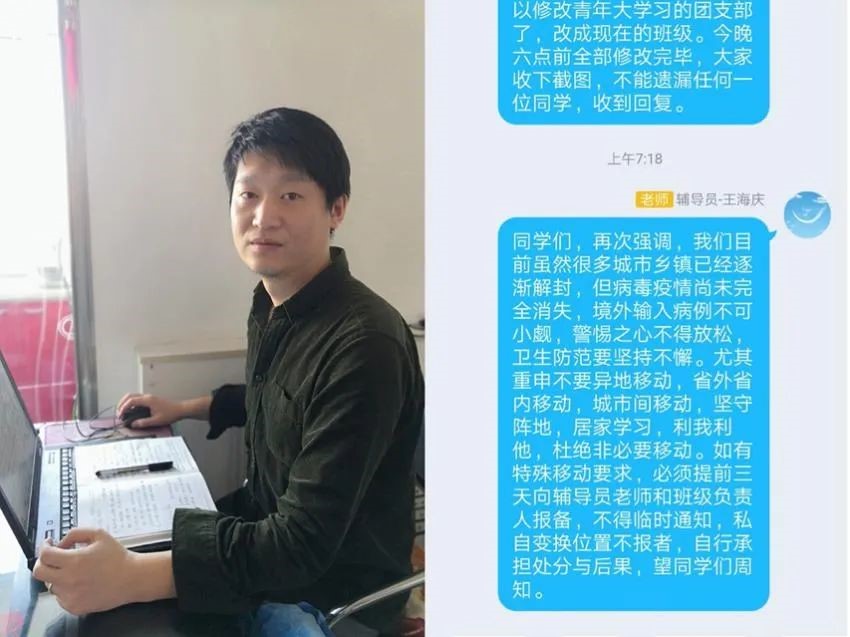 软件学院辅导员王学民说:“当前,新冠肺炎疫情形势逐渐好转,但我们仍然不能松懈,更是不能擅自离开居住地。因为虽然形势有所好转,但是由于国际疫情形势严峻,输入型病例对我国来之不易的大好形势构成了威胁。有一个演示模型,一个5000人的团队,只要其中一个人得了新冠肺炎,将在10天内传染至团队中的所有人。新冠病毒“飞沫传播、灵活机动、长期潜伏、一定致死率”,也让人谈之色变。所以,请大家依然要遵守纪律,在家上课,在家学习,不违反规定、继续宅在家里就是对国家最大的贡献!”