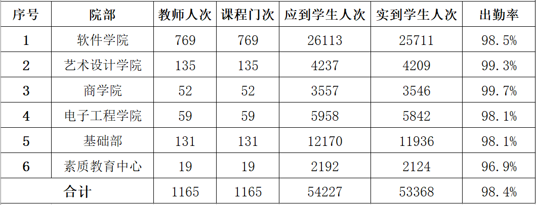 根据教学计划,5月11日—5月17日共开展线上教学课程1165门次,共计1165人次教师在线授课。教务处及各二级学院领导、教研室主任对每门课程进行了教学检查,应到学生54227人次,实到学生53368人次,到课率98.4%。