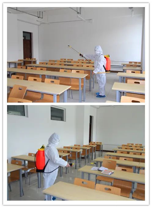 教学楼管理中心病毒消杀人员穿着隔离服、配戴一次性乳胶手套、护目镜、N95口罩,携带装满84消毒液的喷雾器1壶,75%酒精喷壶1个,毛巾2条,到达发热学生所在教室。1.教室消毒:包括对教室地面、桌椅面、窗台、门把手、窗户把手、教学设备、文具等进行消毒。2.途径消毒:发热学生离开教室前往二公寓隔离点后,病毒消杀人员实施途径消毒,包括对既定应急通道地面、楼梯扶手、门把手等进行消毒。