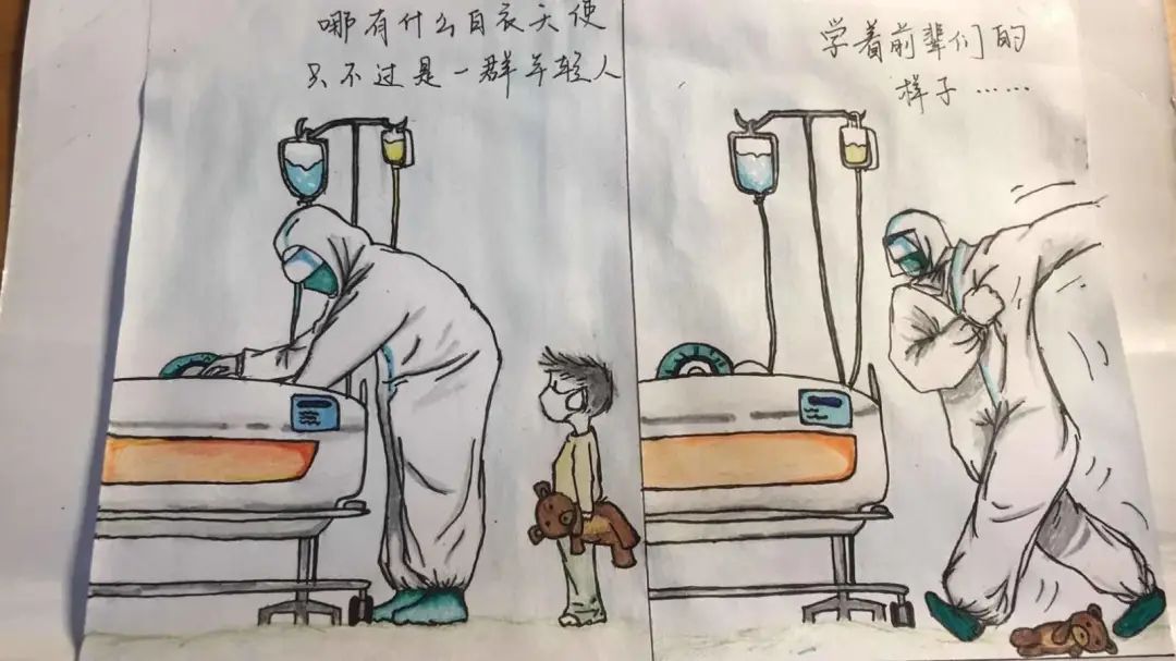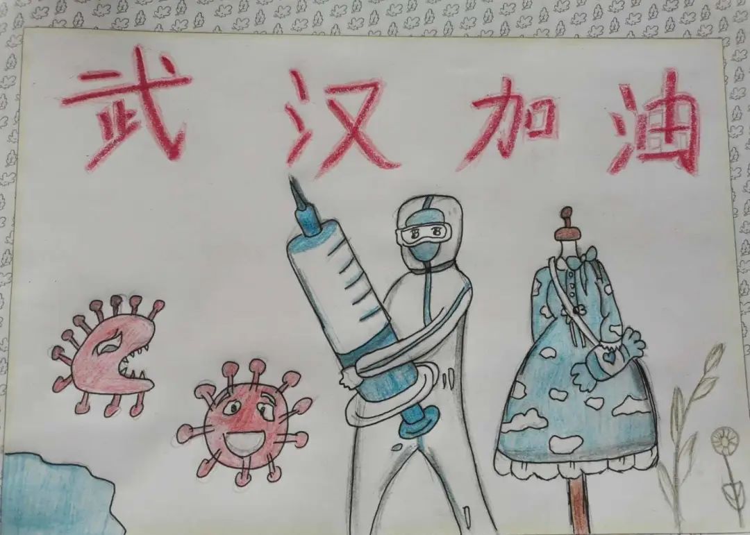设计说明:自新冠肺炎以来,全国上下万众一心,众志成城。医护人员更是站在一线,担起了保家卫国的责任。此次战疫,体现了白衣天使不惧困难风险,乐于奉献的精神。我的妈妈也是一名发热门诊的医生,我想向她致敬,向所有白衣天使致敬。武汉加油!中国加油!一起守望相助,共待春暖花开。