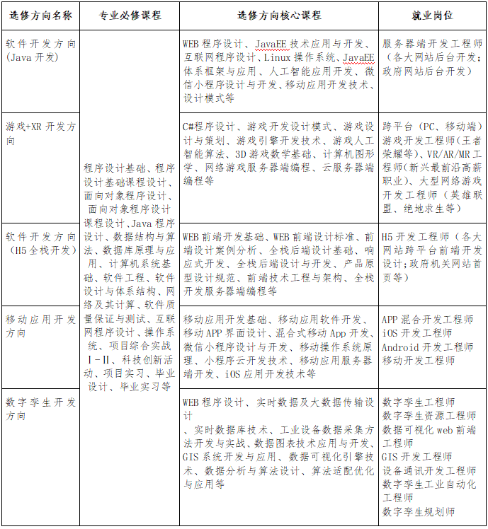 结合社会经济发展和行业产业发展趋势,以行业需求为导向,面向软件工程领域国际前沿,专业分成三个岗位方向,学生可以根据自己的兴趣、爱好自行选择,各岗位方向主要课程如下表所示。