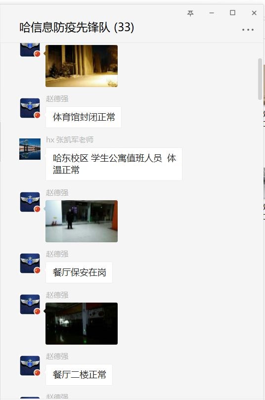 “我校第一批的先锋队队员们,在姜校长、吕书记、关校长三位领导的带领下,凭着为国、为省、为校保安全的赤子之心,在最重要、最危险、最困难的时刻,每个人都毅然决然、义无反顾地决定继续守护我们的家园。这不是简单的决心与决定,这是爱的奉献与责任的呼唤,是人生旅途中与天斗、与地斗、与新冠肺炎斗的再一次挑战,是守护家国情怀、校家情怀的又一亮剑,是与时间赛跑与疫情较量的实战,更是用行动书写生命乐章的真谛!谁无父母老小?谁无家人期盼担忧?可我校这些最可爱的人,用淡定轻松的语气,用朴实无华的语言,用善慈与责任,托起了这没有硝烟且重于泰山、又无可确定期限的重任!这是真正的华夏精神,是将永远镌刻于哈尔滨信息工程学院史册上感动全校的故事。