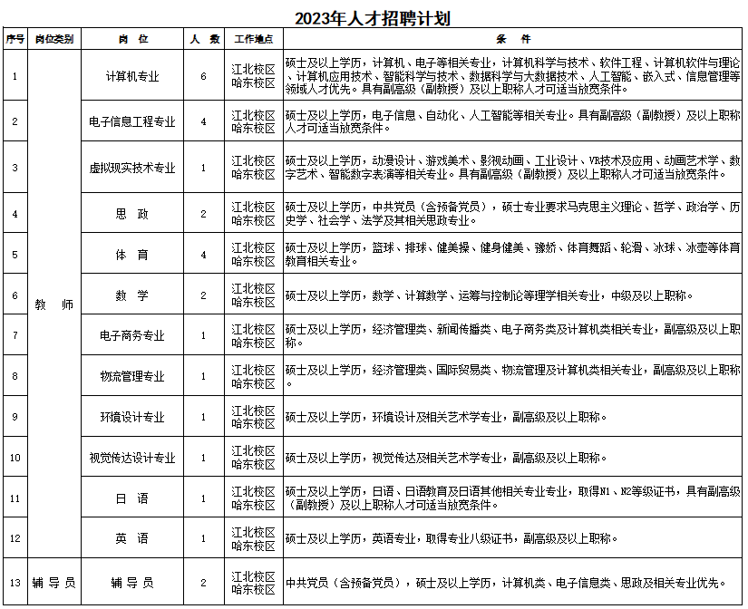 2.符合学校学科、专业建设需要,具有较高的业务素质和良好的职业道德;工作中善于创新、团结协作、事业心强、热爱教育事业,教书育人、为人师表,愿为哈尔滨信息工程学院的发展建设做出贡献。