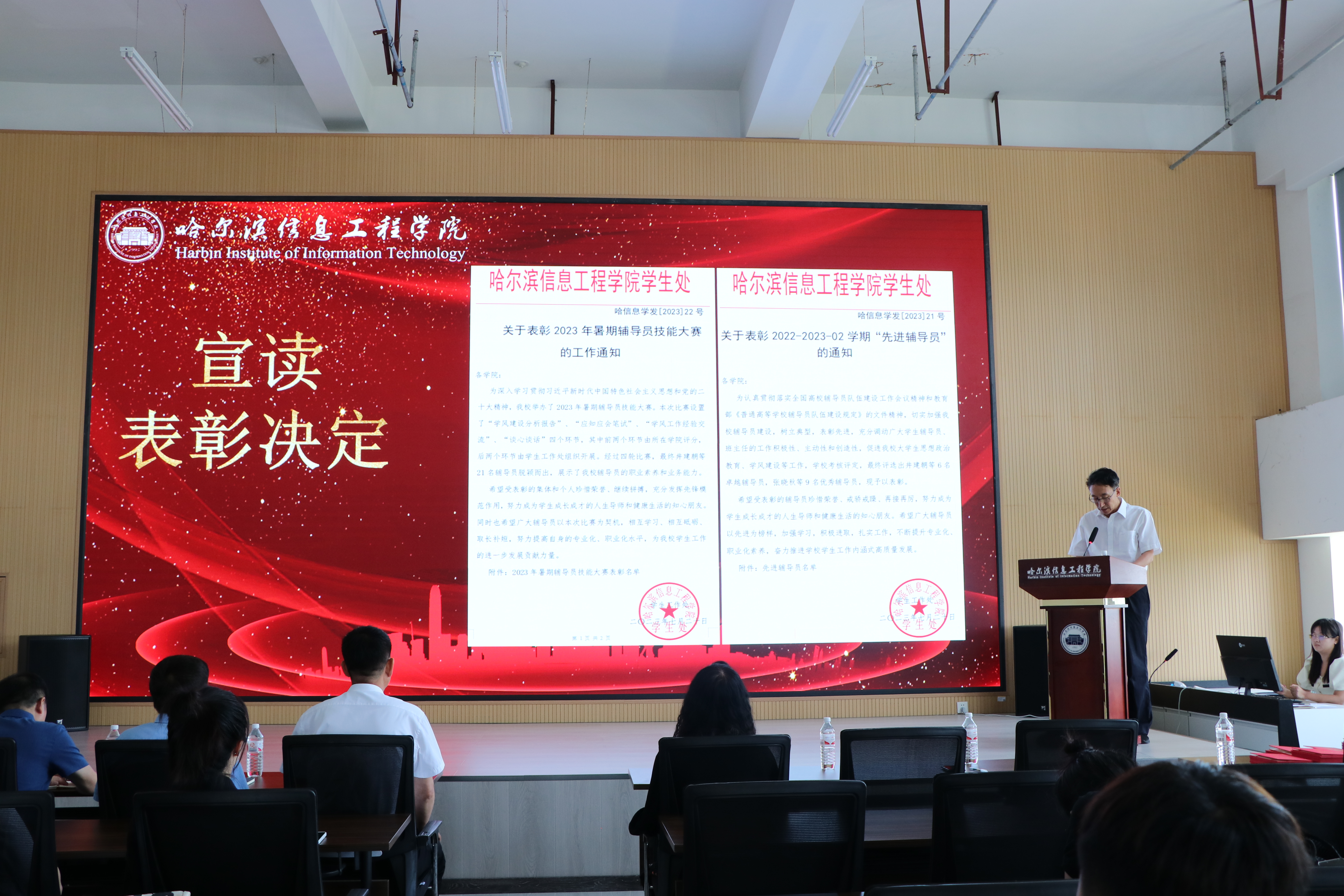 学生处处长王玉珅老师向获得表彰的个人表示祝贺,并宣读《关于表彰2023年暑期辅导员技能大赛的决定》《关于表彰2022-2023-02学期“先进辅导员”的决定》。
