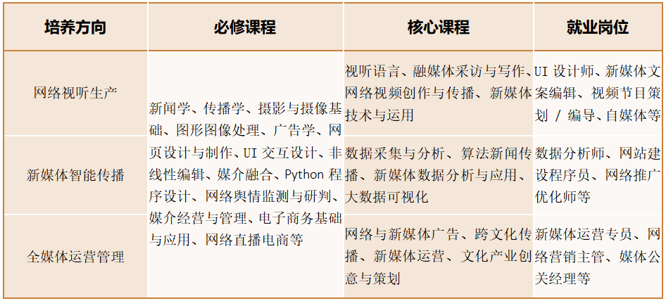 网络与新媒体专业是学院十四五规划的重点建设专业,紧跟时代前沿,将人才培养定位为网络视听生产、新媒体智能传播、全媒体运营管理三个与行业企业人才需求相一致的主流方向。