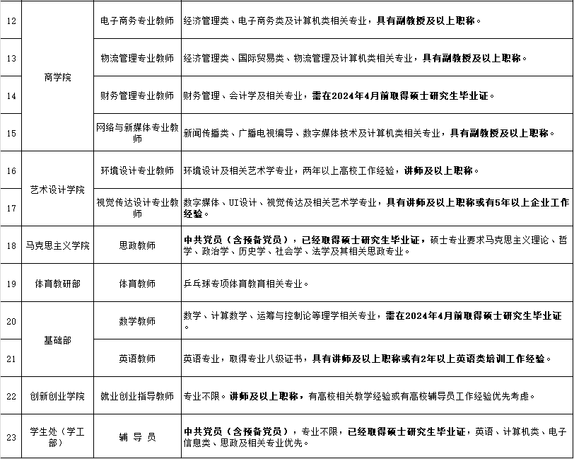 3.应聘人员学历要求硕士研究生及以上学历,本科、硕士所学专业需一致或相近。辅导员需要掌握信息化办公技能并有一定的写作能力。具有副高级及以上专业技术职称人员学历要求可适当放宽。