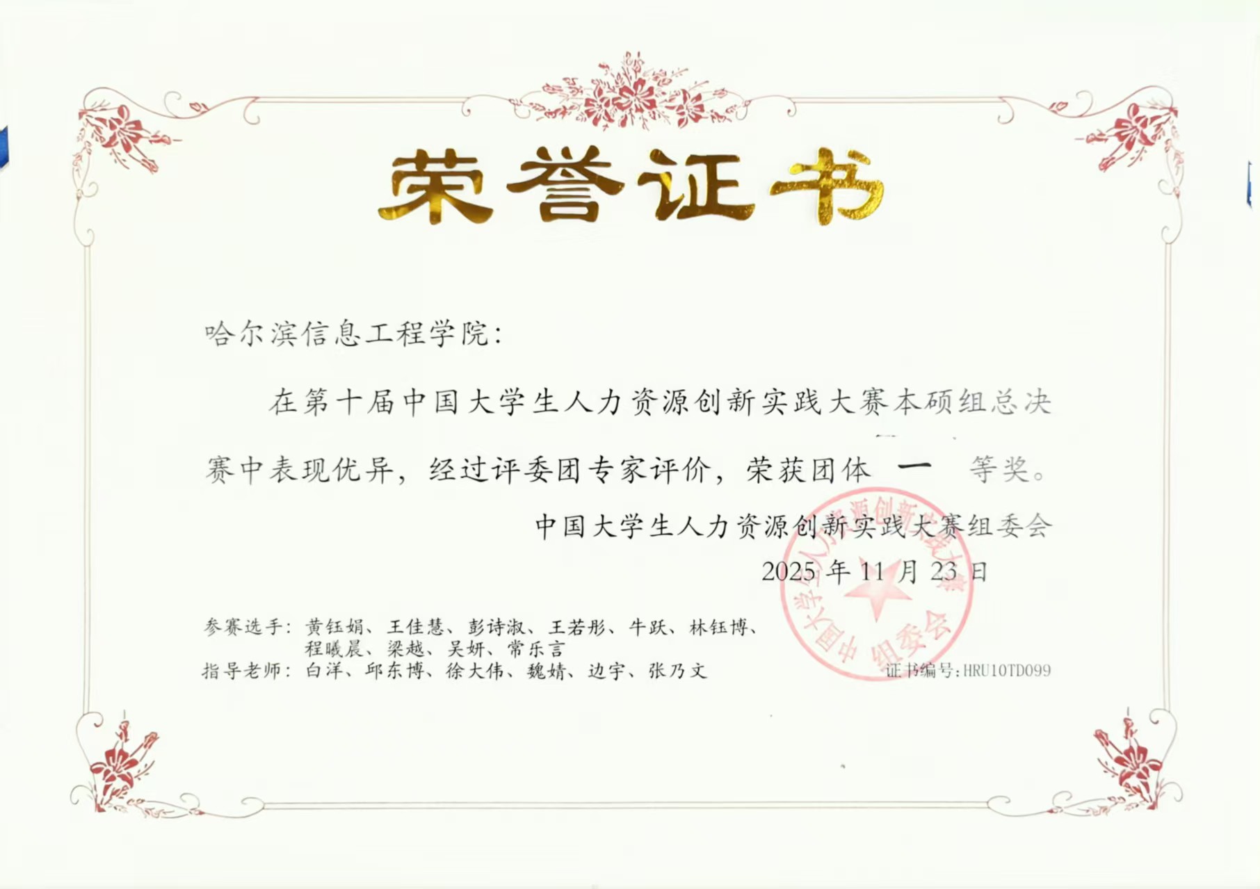 在第十届中国大学生人力资源创新实践大赛中,哈尔滨信息工程学院商学院学子们凭借硬核实力,跻身全国20强!狂揽团体一等奖,个人一等奖6 项、二等奖4 项,包揽全部赛项奖项的耀眼战绩!