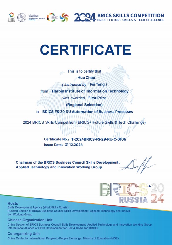 金砖国家职业技能大赛商业流程自动化(财经数字化及机器人流程自动化)赛项全国选拔赛暨国内决赛三等奖、省赛一等奖,省内同类院校唯一获奖学校。