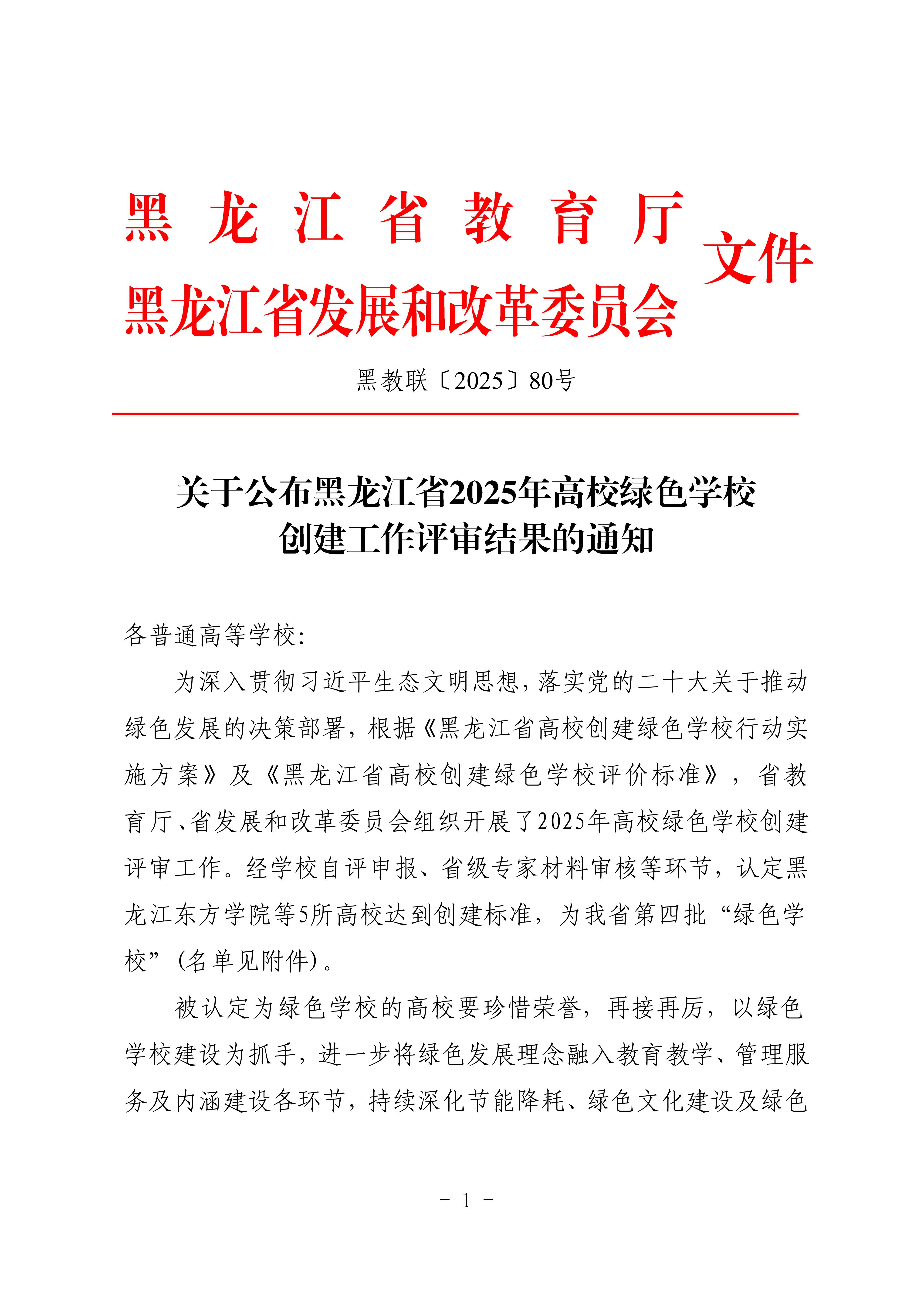 此次评选由黑龙江省教育厅、省发展和改革委员会组织,经过学校自评申报、省级专家材料审核等环节,认定5所高校达到创建标准,我校凭借在绿色发展理念融入教育教学、节能降耗、绿色文化建设等方面的扎实工作,顺利通过认定!