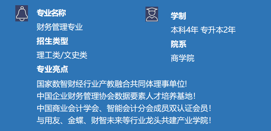 AI时代正重塑财税领域,数智财务迎来崛起新机,财务管理专业依托学校国家示范软件学院,将数智化技术深度融入财务管理专业,培养智能财税领域精英人才!专业开设数智财务、数字金融、CPA 执业三大特色方向,配备财务大数据分析、财务共享、数智金融等前沿实验室,实现“业财融合”数字化培养模式,让专业能力与企业需求同频共振!