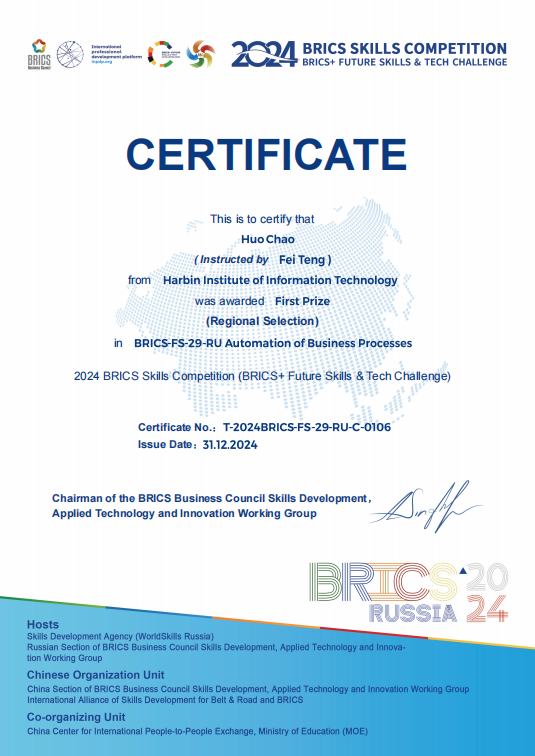 金砖国家职业技能大赛商业流程自动化(财经数字化及机器人流程自动化)赛项全国选拔赛暨国内决赛三等奖、省赛一等奖,省内同类院校唯一获奖学校。