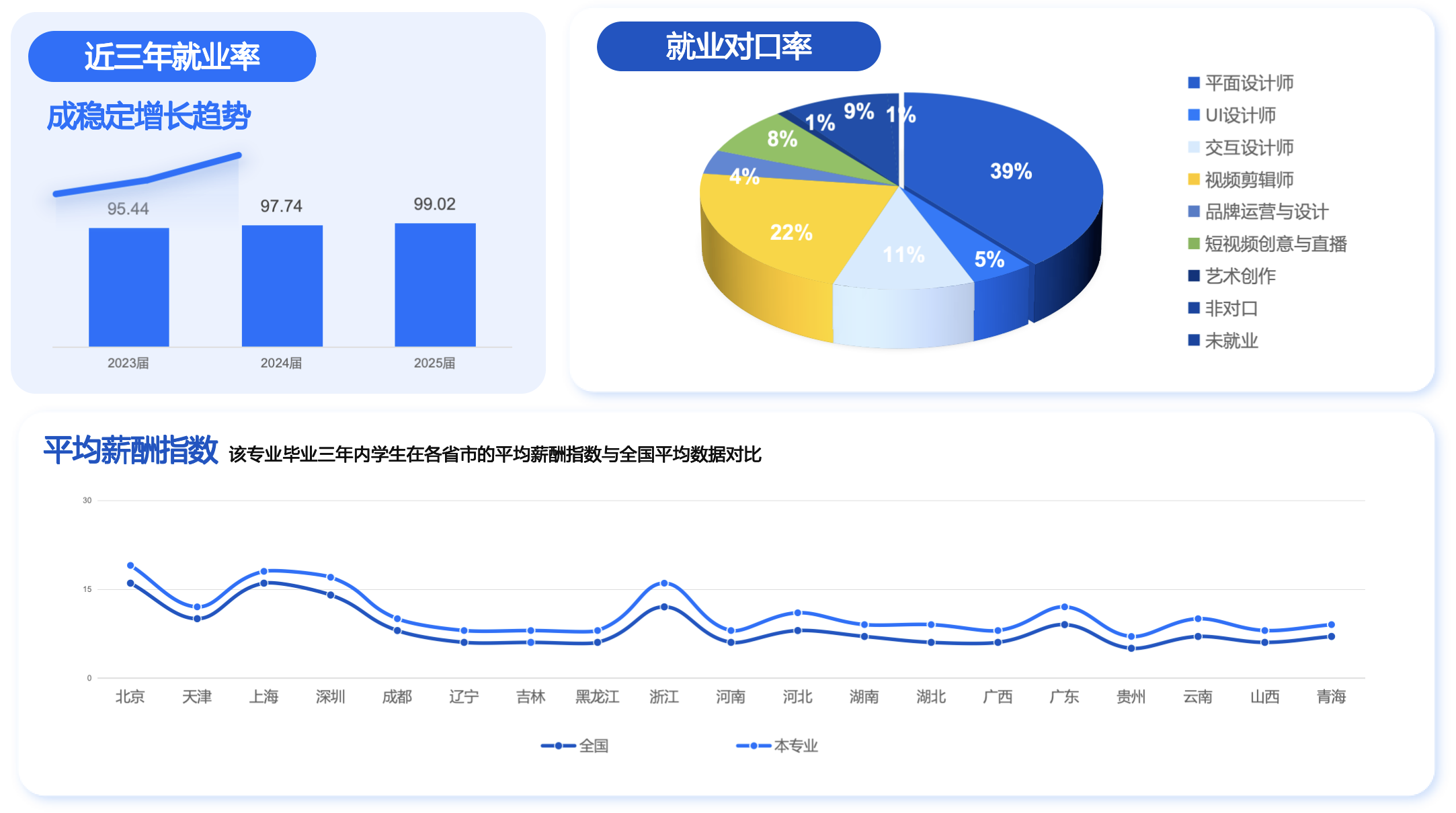 专业就业率持续多年超95%,2025届达99.02%,远超全国艺术类专业平均就业率及省内同类院校水平,实现毕业即就业,就业竞争力强劲。