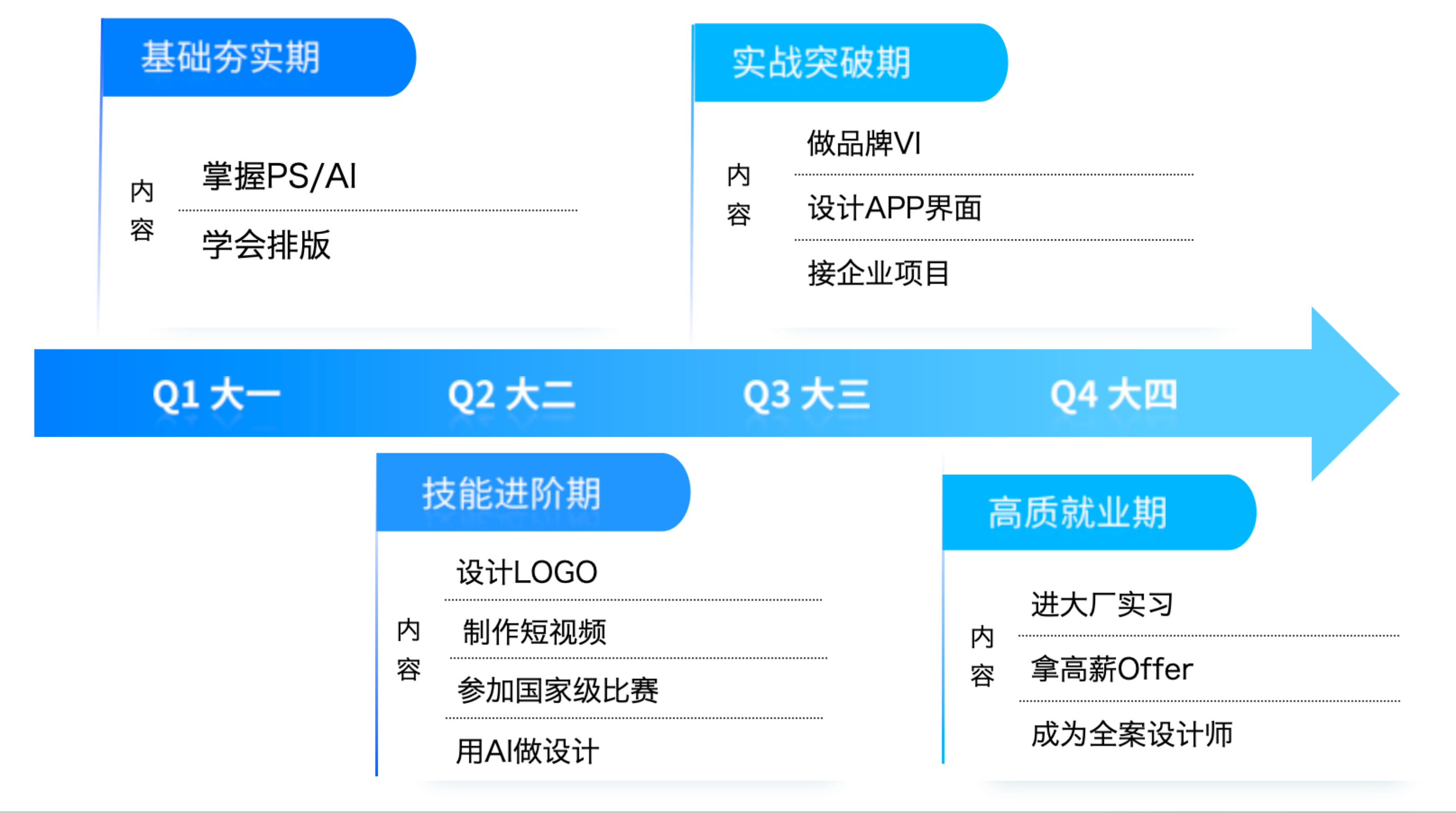 大四能力整合:在长期积累的基础上,通过企业实习、毕业实习等环节,实现从项目实践到岗位能力的最终转化。