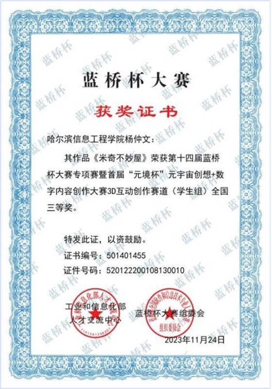 2023年第十四届蓝桥杯大赛专项赛暨首届“元境杯”元宇宙创想+数字内容创作大赛国赛三等奖3项;