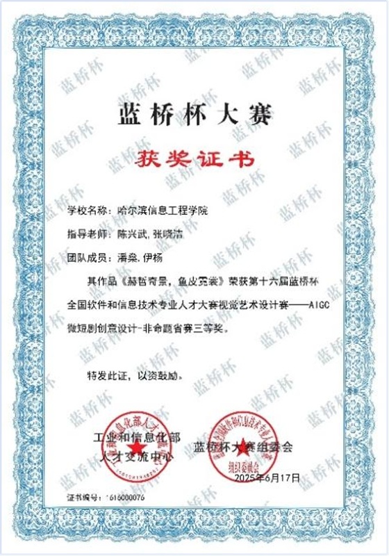 2025年第三届"元创未来"元宇宙设计创意大赛国赛优秀奖2项;第十六届蓝桥杯大赛首届AIGC微短剧设计赛道省赛三等奖1项;