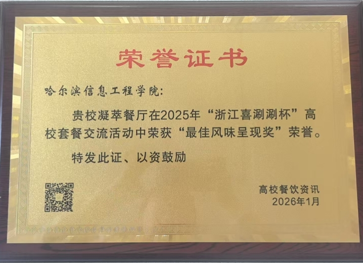 官方捷报传来!据全国高校餐饮资讯权威发布,2025年“浙江喜涮涮杯”高校套餐交流活动获奖名单正式公示。在全国数十所参赛高校及团餐单位中,哈尔滨信息工程学院凭借出众的风味呈现实力成功入选,荣登“最佳风味呈现奖”获奖名单。