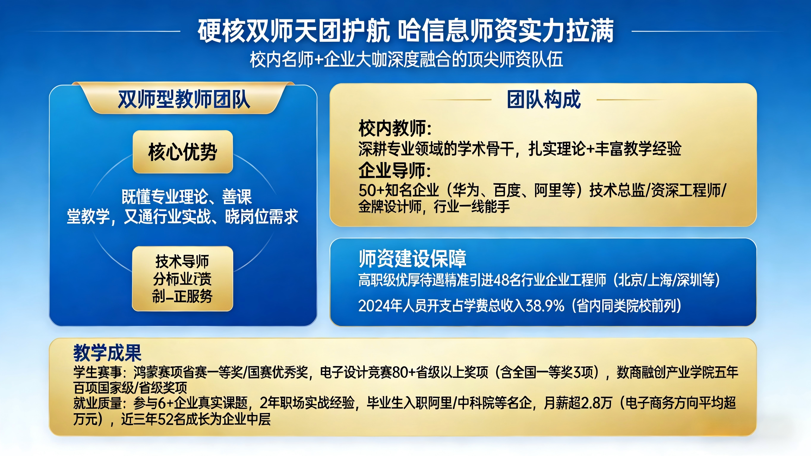 择校先择师,良师方能育良才!哈尔滨信息工程学院坚守非盈利办学初心,将核心资源倾注于师资建设,打造出一支“校内名师+企业大咖”深度融合的顶尖师资队伍,其中“双师型教师团队”更是我校育人的核心王牌。