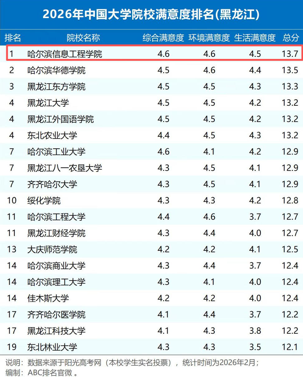在近日发布的2026年中国大学院校满意度排名中,哈尔滨信息工程学院凭借出色的综合实力和良好的学子口碑,从全国众多高校中脱颖而出,取得了历史性突破!